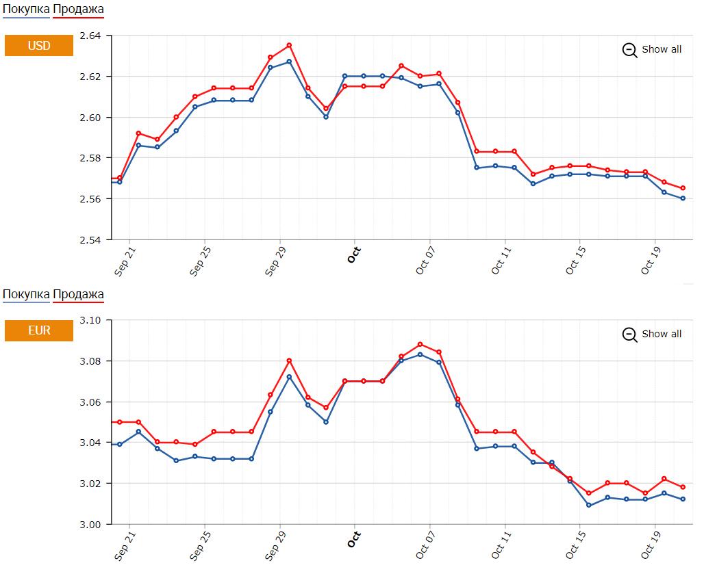 Несмотря на небольшие различия в амплитуде колебаний курсов доллара и евро по отношению к белорусскому рублю, они в целом двигаются синхронно: одновременный сильный взлет во второй половине августа, затем снижение в первые 20 дней сентября, рост в последнюю декаду сентября – и снижение с начала октября.