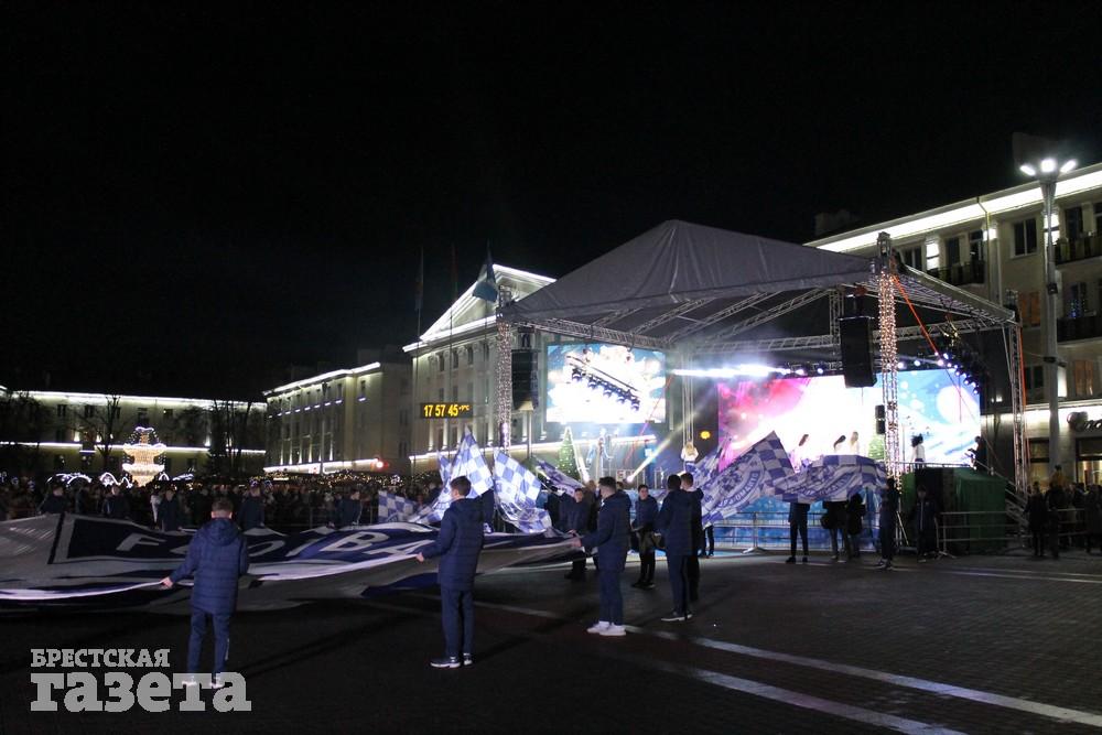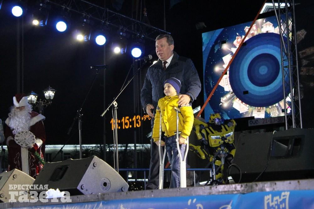 Для зажжения главной новогодней елки города на сцену пригласили председателя Брестского горисполкома Александра Рогачука, который сделал это в компании преданного фаната ФК «Динамо Брест» Никиты Полуянова и легендарного футболиста брестского футбольного клуба Романа Василюка.