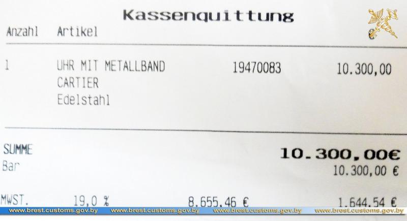 В ходе таможенного контроля у 40-летней пассажирки, гражданки России, автомобиля «Тойота Камри» среди личных вещей обнаружена фирменная коробка с наручными часами Cartier производства Швейцарии. Согласно документам Тах Free и кассовому чеку, стоимость незадекларированных часов составила 10,3 тыс. евро, сообщает Брестская таможня.