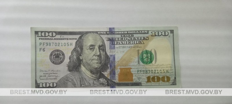 В Московский РУВД Бреста обратился сотрудник банка и рассказал, что 63-летняя жительница России принесла к обмену поддельные 100 долларов США. Женщина пояснила, что купюру получила около 10 лет назад от знакомых в качестве подарка. О том, что купюра поддельная, она не знала.