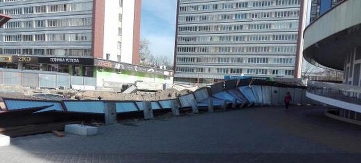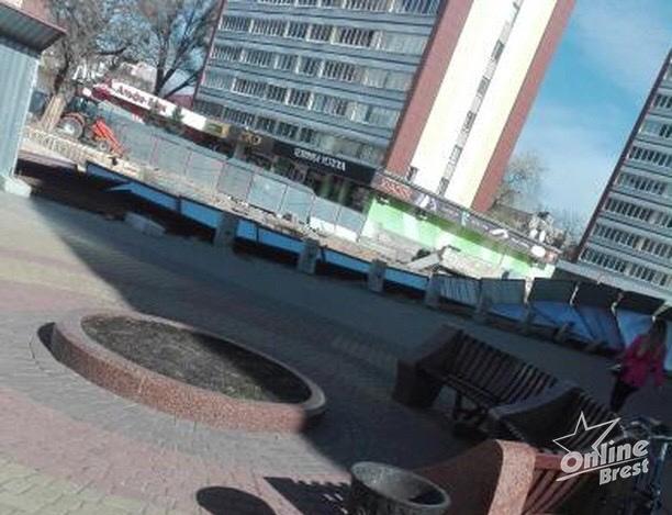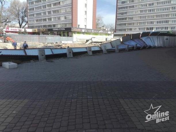 «Из-за сильного ветра на ул. Советской упал забор, который ограждает строительство фонтана», — сообщил днем 8 марта читатель onlinebrest.