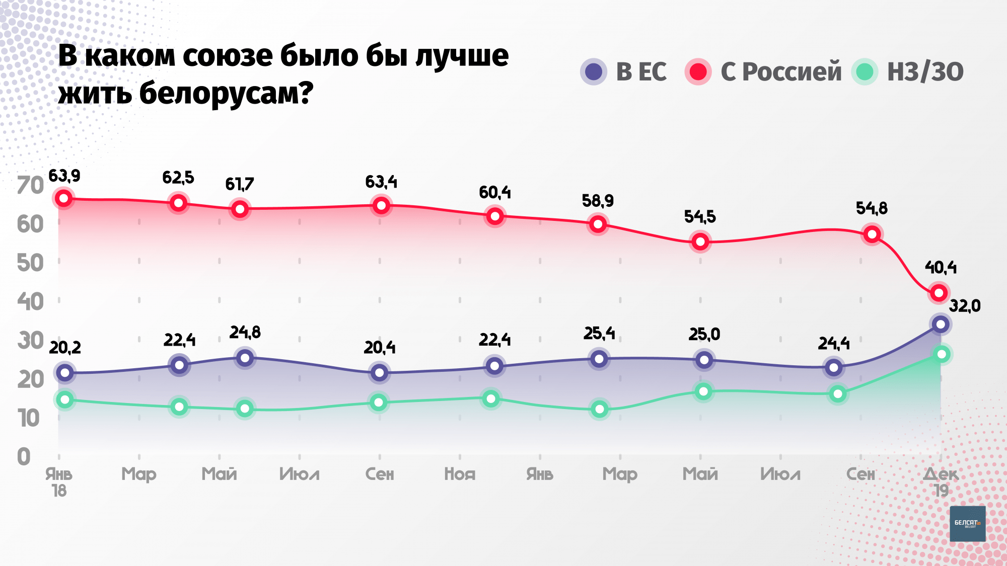 Из сведений Белорусской аналитической мастерской следует, что одновременно со снижением сторонников союза Беларуси и России усилились проевропейские настроения в обществе: число сторонников вступления в Евросоюз выросло с 24,4% до 32%.