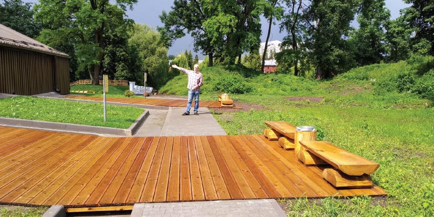 Лавки, мусорные контейнеры и даже парковки для велосипедов изготовлены из цельного дуба. Из него сделаны и бревна, на которых мастера организации вырезали имена, связанные с тысячелетней историей Бреста.