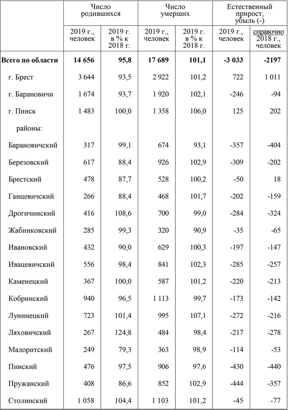 Во всех остальных районах Брестской области смертность превысила рождаемость. Самая большая убыль населения в прошлом году наблюдалась в Пружанском (-444), Пинском (-430) и Барановичском (-357) районах.