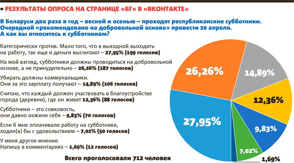 «БГ» провела опрос на своей странице в «ВКонтакте» и выяснила, как наши читатели относятся к субботникам. За двое суток в нашем опросе приняли участие 712 человек. Чуть более половины из них — 52,76% — высказались против субботников. Причем почти 28% (199 человек) категорически против подобных мероприятий. 14,89% наших респондентов (106 человек) считают, что убирать должны коммунальщики, так как они за это получают зарплату. По мнению 9,83% опрошенных (70 человек), субботники — это совковость, и они давно изжили себя.