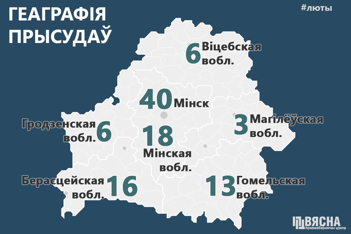 Больше всего приговоров по делам, связанным с выражением политической позиции, вынесено в Минске и Минской области. Брестская область — на втором месте с результатом в 16 приговоров. Меньше всего вердиктов вынесли в Могилевской области — 3.