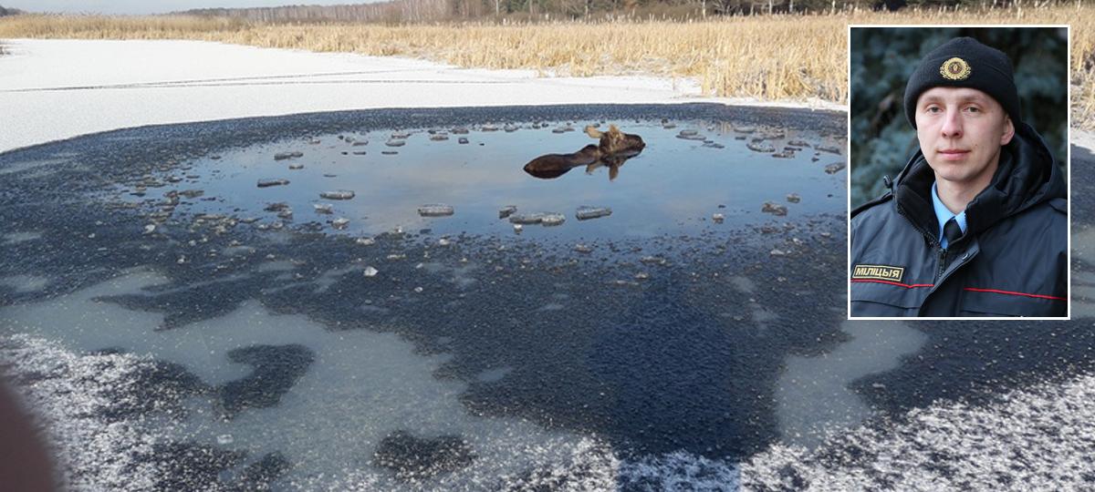 На днях они ехали на служебном транспорте по маршруту вдоль Несвича, притока реки Брагинка, что недалеко от выселенного населенного пункта Крюки. В ста метрах о дороги заприметили темное пятно среди льда. Милиционеры остановились, подошли к берегу и увидели, что в центре водоема в проруби застрял лось.