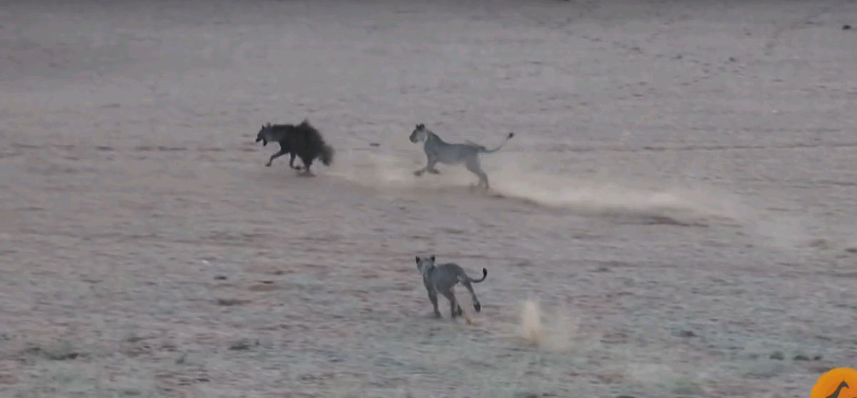 На ролике видно, что гиена, сама того не зная, набрела в львиный прайд, однако она быстро заметила поджидающих ее львов и принялась бежать. Пять львов так и не смогли ее догнать.