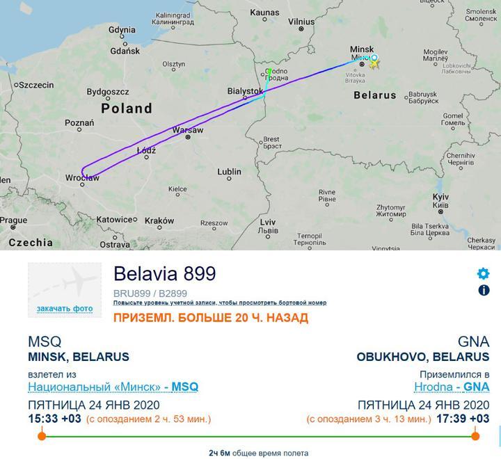 В пятницу, 24 января, в Гродно совершил посадку самолет «Белавиа», который следовал из Минска в Мюнхен. Об этом tut.by сообщили несколько пассажиров, которые летели этим рейсом. На сайте flightaware, который позволяет отслеживать маршруты лайнеров по всему миру, видно, что самолет (рейс B2899) развернулся недалеко от польского Вроцлава и вернулся в Беларусь – но не в Минск, а в Гродно. По сообщениям пассажиров, там с борта сняли 6 человек.