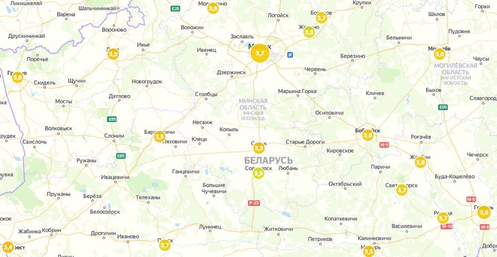 Самый высокий средний уровень самоизоляции по стране – в Полоцке и Солигорске (3,9). Немного ниже балл у жителей Витебска и Жодино (3,8). С индексом 3,7 на карте показаны Минск, Борисов, Пинск, Светлогорск, Речица. С баллом 3,6 – Гродно, Гомель, Могилев, Орша, Молодечно, Бобруйск, Жлобин. Ниже балл у Барановичей, Слуцка, Лиды, Мозыря (3,5).