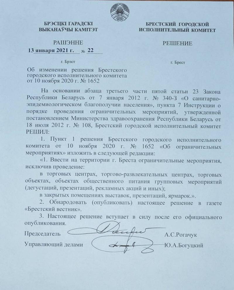 С 14 января в Бресте отменены ограничения по времени работы объектов общественного питания, объектов, в которых оказываются услуги по организации отдыха и развлечений, а также игорных заведений. До сегодня вышеперечисленные объекты работали до 23.00. Теперь они могут вернуться к прежнему режиму работы. Об этом в своем телеграм-канале сообщил председатель Брестского горисполкома Александр Рогачук.