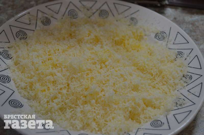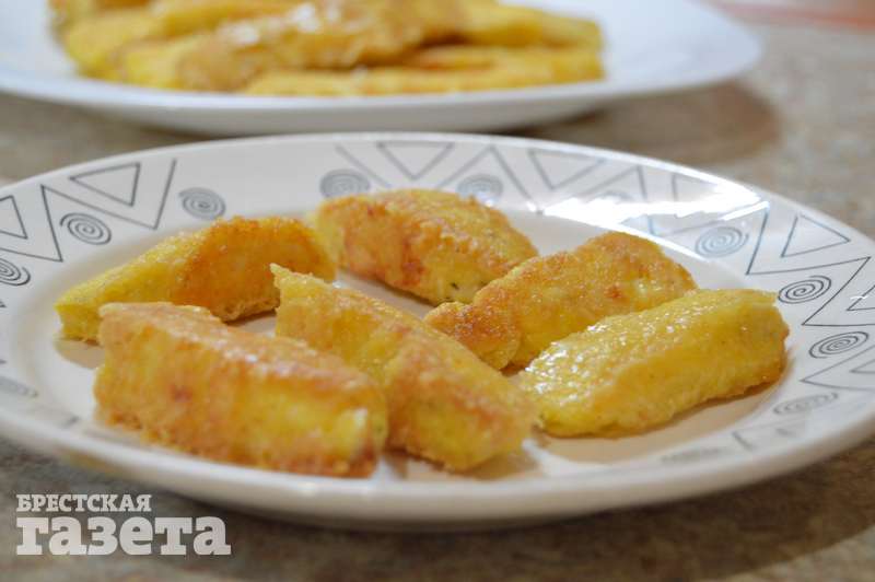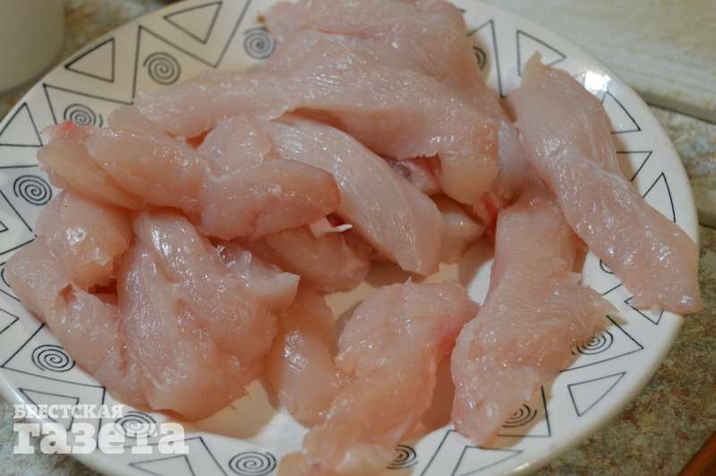 Готовим: Нарежьте куриное филе на полоски средней ширины и длины (приблизительно 1,5х4 см). Натрите сыр на мелкой терке в отдельную посуду. В другой емкости разбейте куриные яйца, посолите и приправьте их, после чего хорошенько взбейте вилкой.