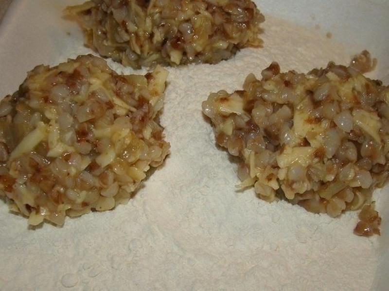 Готовим: Лук спассеруйтете на сливочном масле. Сыр натрите на крупной терке. Смешайте вареную гречку, лук и сыр. Вбейте яйца, посолите и поперчите.